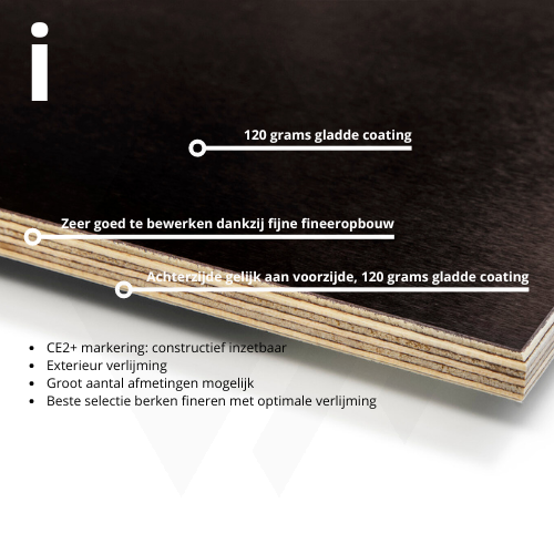 4mm Berken betonplex is exterieur verlijmd en opgebouwd uit door en door berken fineren. Deze platen zijn voorzien van een tweezijdige donkerbruine 120gr/m2 fenolharscoating. Door de sterke coating bieden de platen een optimale bescherming tegen weersinvloeden, vocht en alkalihoudend cement. Door de zeer hoge kwaliteit topfineren laten deze berken betonplex platen nagenoeg geen aftekening in het beton achter.